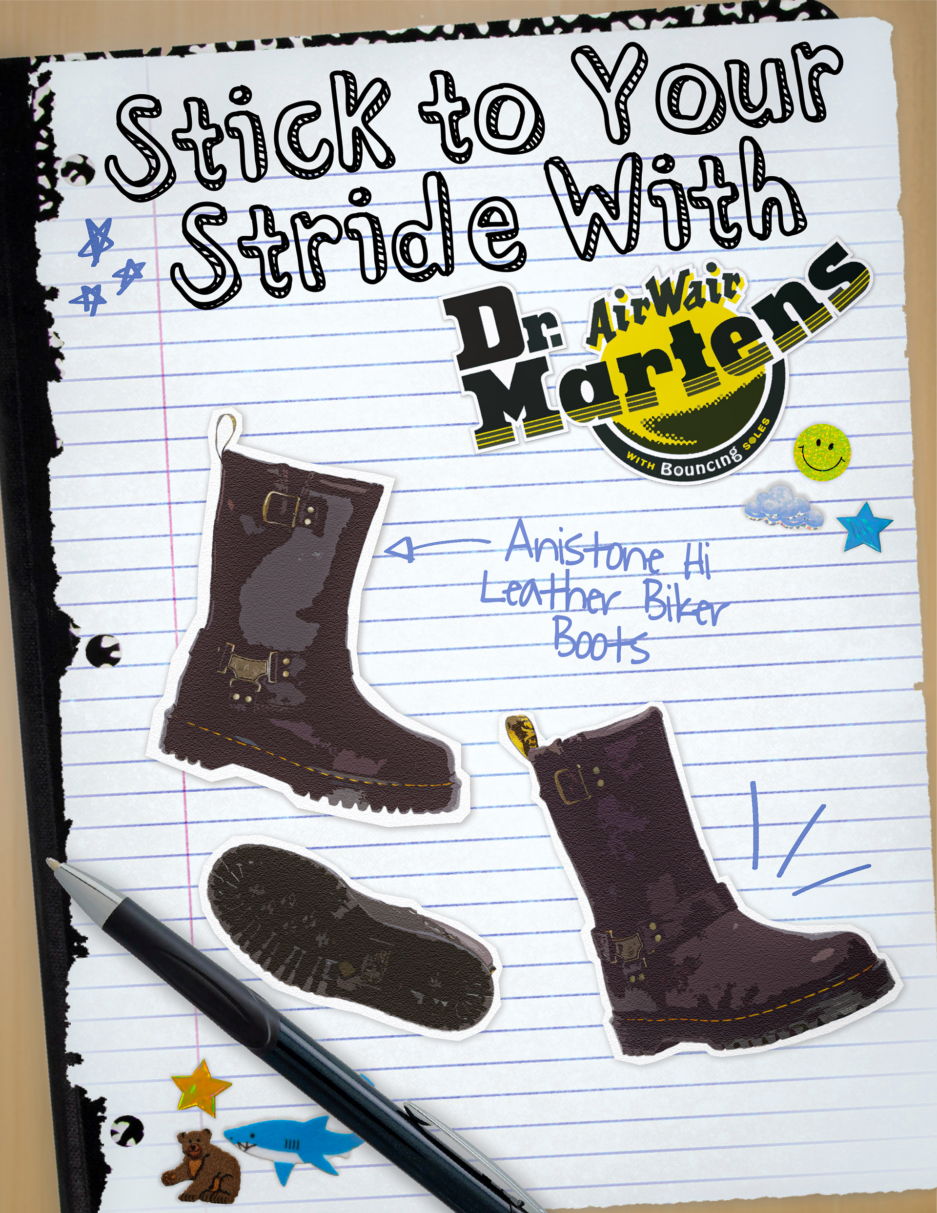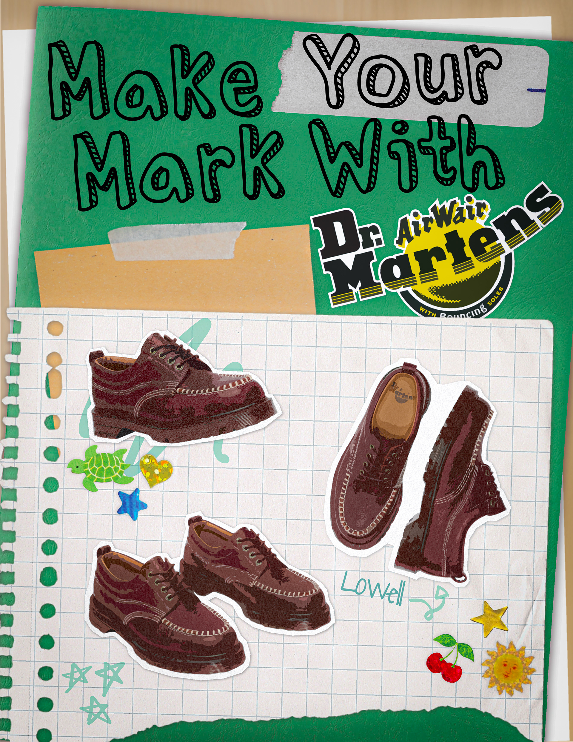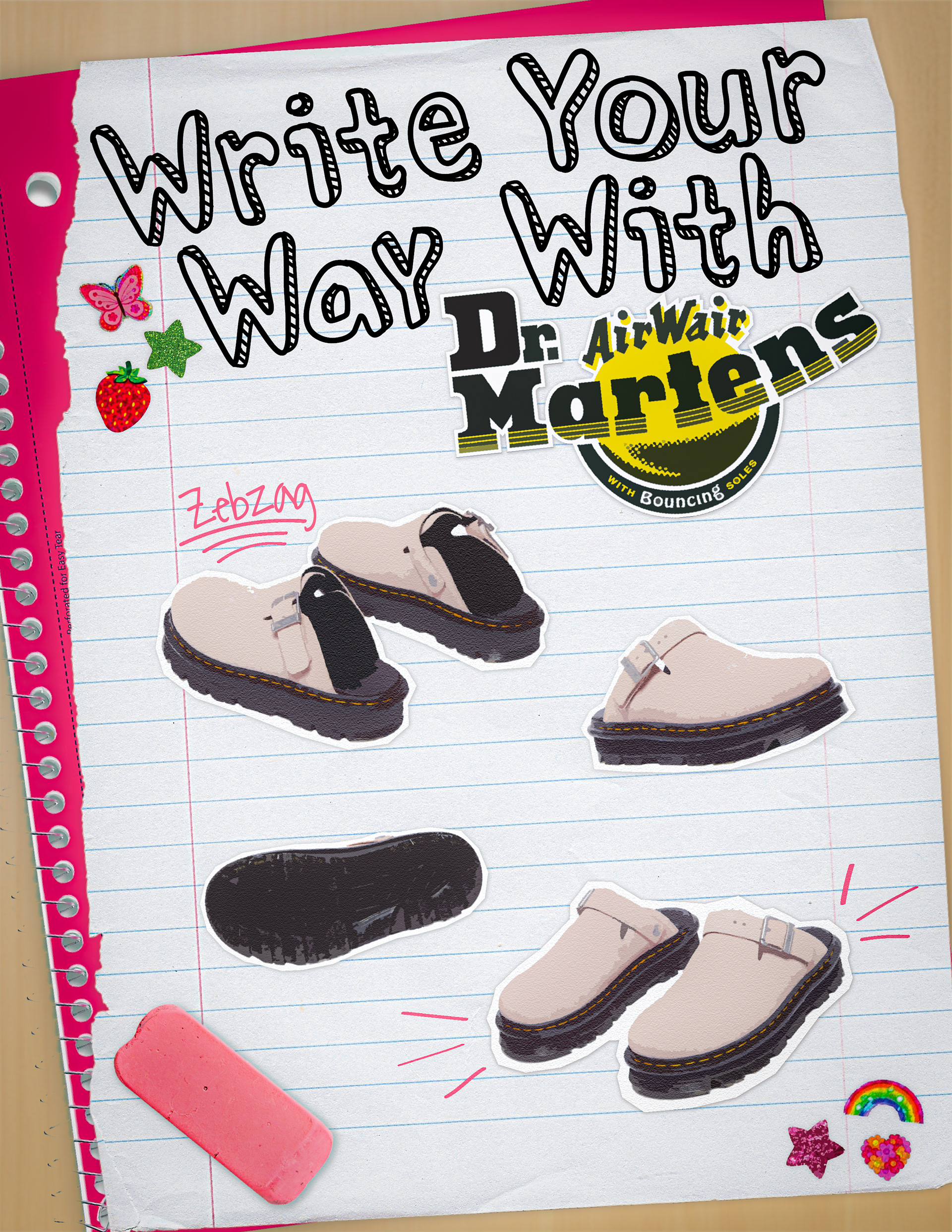 I reimagined Dr. Martens through a playful back-to-school lens, using notebook textures, hand-drawn doodles, and cut out sticker elements to highlight creativity and individuality. Blending nostalgic classroom references with bold, contemporary visuals, the campaign positions the brand as a tool for self expression, encouraging audiences to “Write Your Way,” “Stick to Your Stride,” and “Make Your Mark.” This concept allowed me to merge strategic brand storytelling with my personal design style, creating a cohesive visual world that feels expressive, youthful, and unapologetically original.